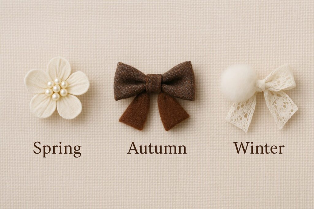 – アクセサリーを使って季節感を演出。春は花モチーフ、秋はリボン×ウール、冬はレース×ファーなど、シーンごとに雰囲気を変える。