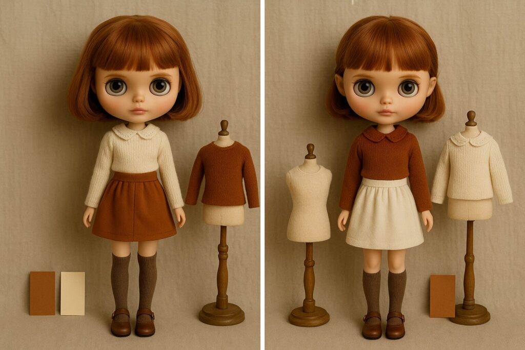 ブライス服のコーディネートでは、色・柄・素材の三つをどう組み合わせるかが全体の印象を大きく決めます。基本は“色の統一感”“柄のリズム”“素材の相性”を意識すること。ここでは、初心者さんにも実践しやすいポイントと具体例を添えて紹介します。