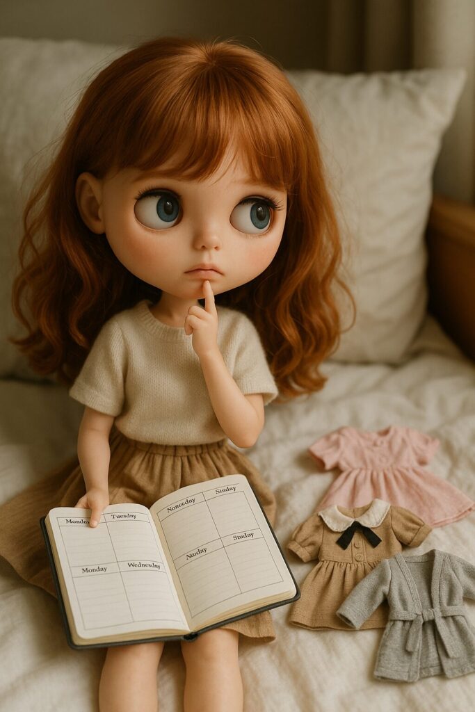 計画的に組み立てれば、同じアイテムでも週を通じて飽きのこないコーデを作れます。小さな変化を積み重ねて、ブライス服の着回しを楽しんでください。