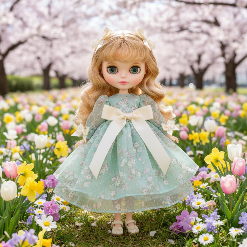 同じ花柄生地に対して、ベース色をミントグリーンに変更、裾に立体的なタックとレースの縁取りを追加。アクセントにクリーム色のリボンを配置。立ち姿が自然で、光の当たり具合で布の風合いが際立つ。