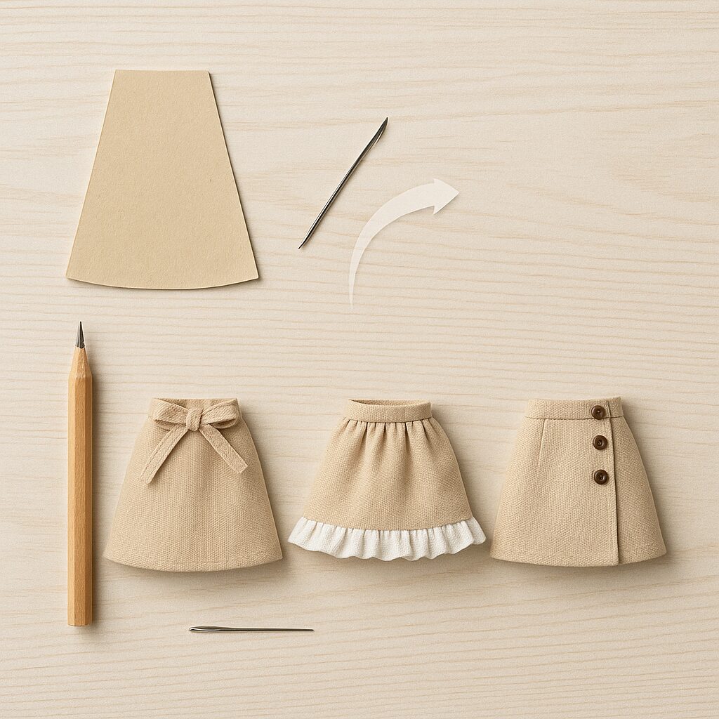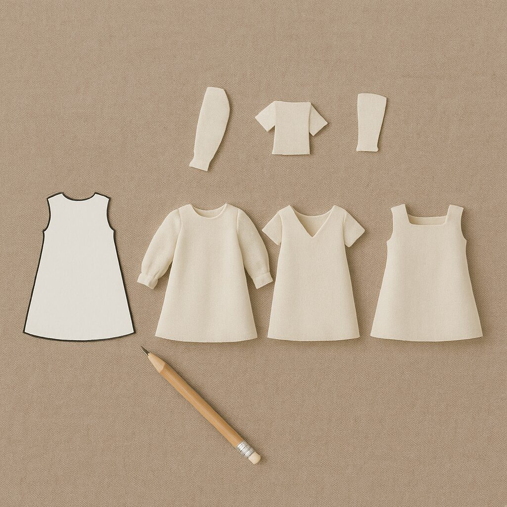 時間をかけずにドール服を作るには、デザインを絞りつつ、手順をシンプルにする工夫が最も効果的です。ここでは「1パターンで複数デザインを作る工夫」「伸縮素材と飾りで手間を減らす」「直線縫いだけで完成させるテクニック」の3章構成で、初心者さんでも挫折せずに作れるコツを具体例とともに紹介します。