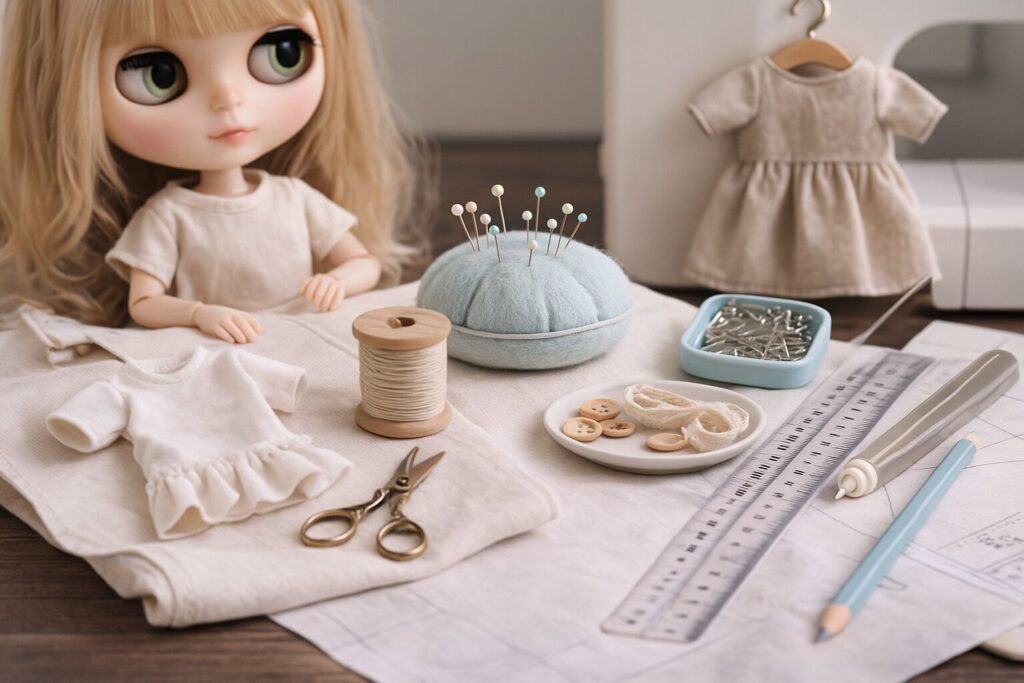 ドール服作りの第一歩は「準備の整頓」です。作業を始める前に、サイズのチェックと型紙の再利用計画を立てましょう。まずはドールの胸囲・ウエスト・着丈・袖丈などの基本寸法を確認。複数のデザインで共通するサイズ要素を把握しておくと、型紙を使い回す幅が広がります。型紙は紙の状態で保管せず、布や透明プラスチックに貼っておくと取り出しやすく、再利用時のずれが減少します。