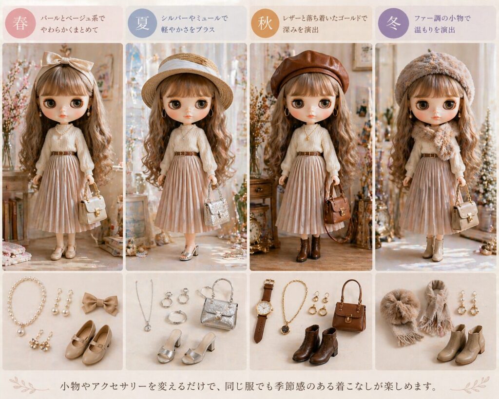 春はパールとベージュ系でやわらかくまとめ、夏はシルバーやミュールで軽さを出し、秋はレザーと落ち着いたゴールドで深みを加え、冬はファー調の小物で温もりを演出すると、同じ服でも季節感をしっかり出すことができます。